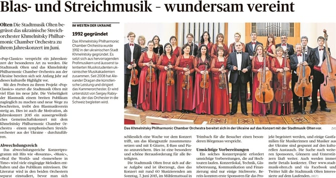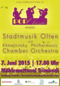 Am Sonntag 7. Juni 2015 organisiert die Stadtmusik Olten ein einmaliges Konzert zusammen mit dem «Khmelnitsky Philharmonic Chamber Orchestra» unter dem Motto «Pop-Classics» im Mühlemattsaal in Trimbach. Hier erfahrt dir immer das aktuellste von diesem besonderen Projekt.