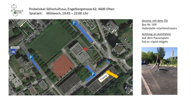 Die Stadtmusik Olten probt wöchentlich im Probelokal im Oltner Sälischulhaus. Hier finden Sie den detaillierten Probenplan mit den aktuellen Daten bis Januar 2024: